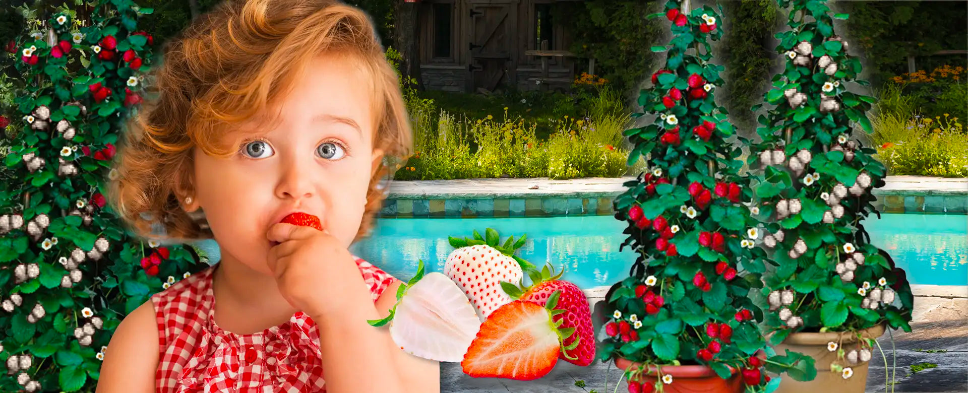 Das Kletterwachstum dieser neuen Varietät kann eine Höhe von bis zu 1,20 m und mehr erreichen. 5 Monate im Jahr lang trägt die Erdbeerpflanze schöne, wohlgeformte Beeren. In der angegebenen Höhe können Sie ohne große Mühe große, saftige Erdbeeren ernten, deren authentischer, charakteristischer Erdbeergeschmack an die unverfälschte Vielfalt von Aroma jener Früchte erinnert, die wir als Kinder während unserer Ferien auf dem Land pflückten.